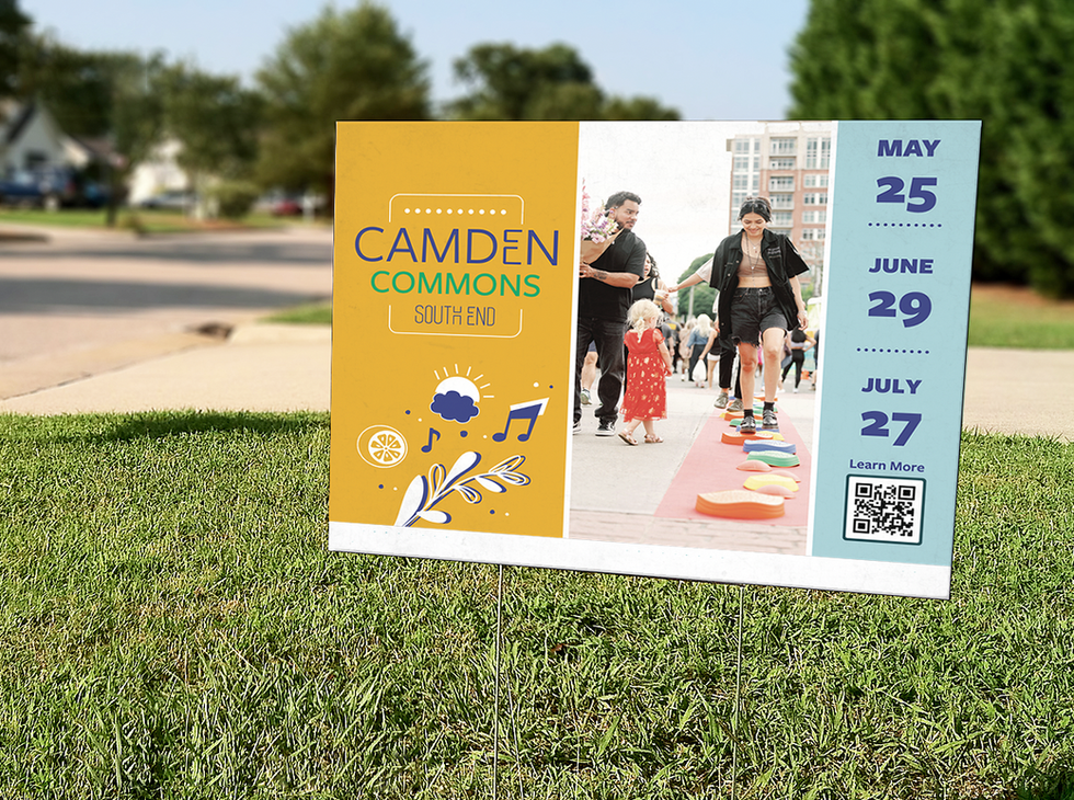 Camden Commons was an established event in South End. But at first glance, it wasn't clear where the event was and how it was connected to South End. In 2024, Charlotte Center City Partners decided to explore a brand refresh, and that refresh was implemented for the 2025 Camden Commons events. The refresh clearly shows that the event takes place in South End, and the look and feel better connect to South End's branding. The refresh also utilizes bright colors and graphics that tie into the spring and summer seasons.